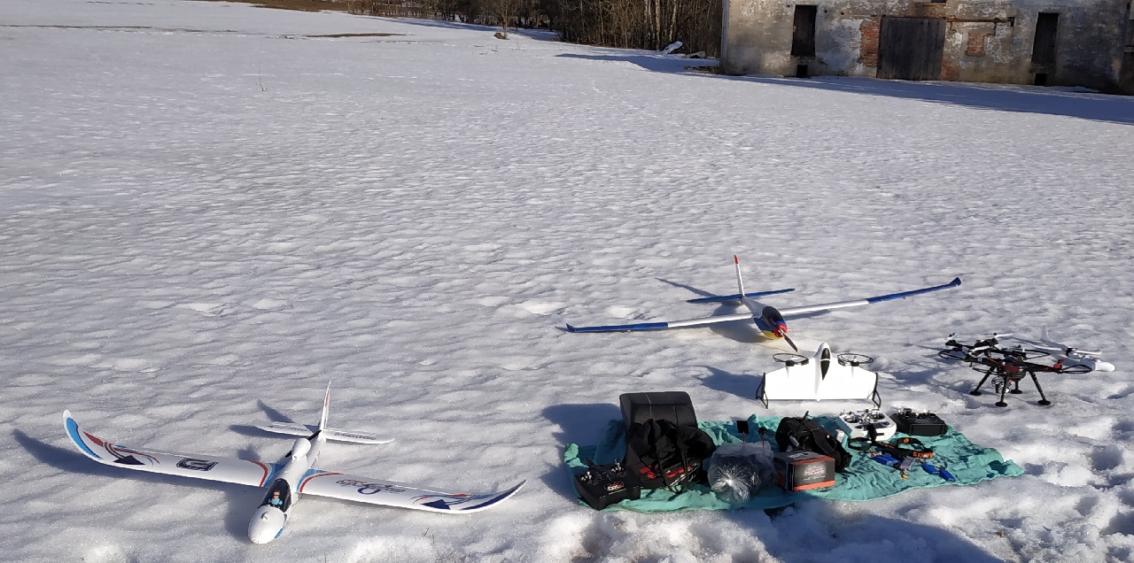 Společné zimní létání s kolegy modeláři na domácím "letišti" doma u JoskyPilota v únoru 2019. Modely kolegů zleva MilanDůchodce (Beta 1400), JoskyPilota (Gamma 2100), před ním můj dvoumotorový VTOL E-Flite XVERT s kolmým startem a vpravo moje koptéra XK Detect X-380. Za koptérou se krčí ještě malá koptérka Tarantula a malý RC model Joskova syna.