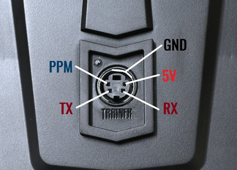 Zdířka označená jako 5V je na vysílači učitele vstup pro signál PPM IN a je propojená se zdířkou PPM OUT na straně žáka jedním vodičem.