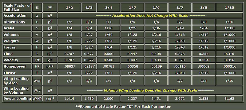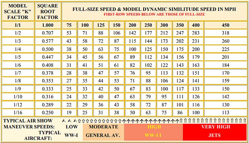 Podle té první tabulky, která určuje pouze rychlost bez ohledu na přesný typ letadla, by měl mít model WW1 letadla v měřítku 1:8 rychlost ještě menší, 43,5km/h.