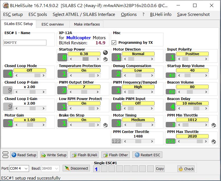 - PPM Min/Center/Max Throttle: 1012 / 1488 / 2020 – hodnoty pro minimální, středový a maximální plyn. Pomáhá kalibraci.