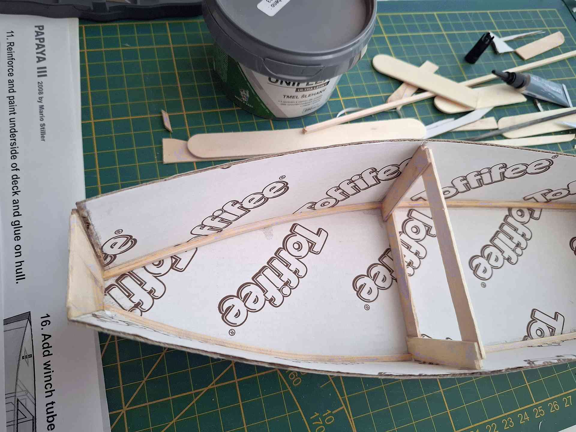Po prohlížení dostupných plánků jsem zvolil plánek Papaya 3. I když je to úplně první plachetnice co jsem kdy stavěl, bude to spíše jenom inspirace, než že bych se plánku tvrdě držel. Hned na začátku jsem zvolil stavbu z dostupných materiálů a pokračuji již v tradici stavění z kartónu, lepenky a dřevěných špachtlí a míchátek coby nosných stavebních materiálů jako tady viewtopic.php?p=13744#p13744