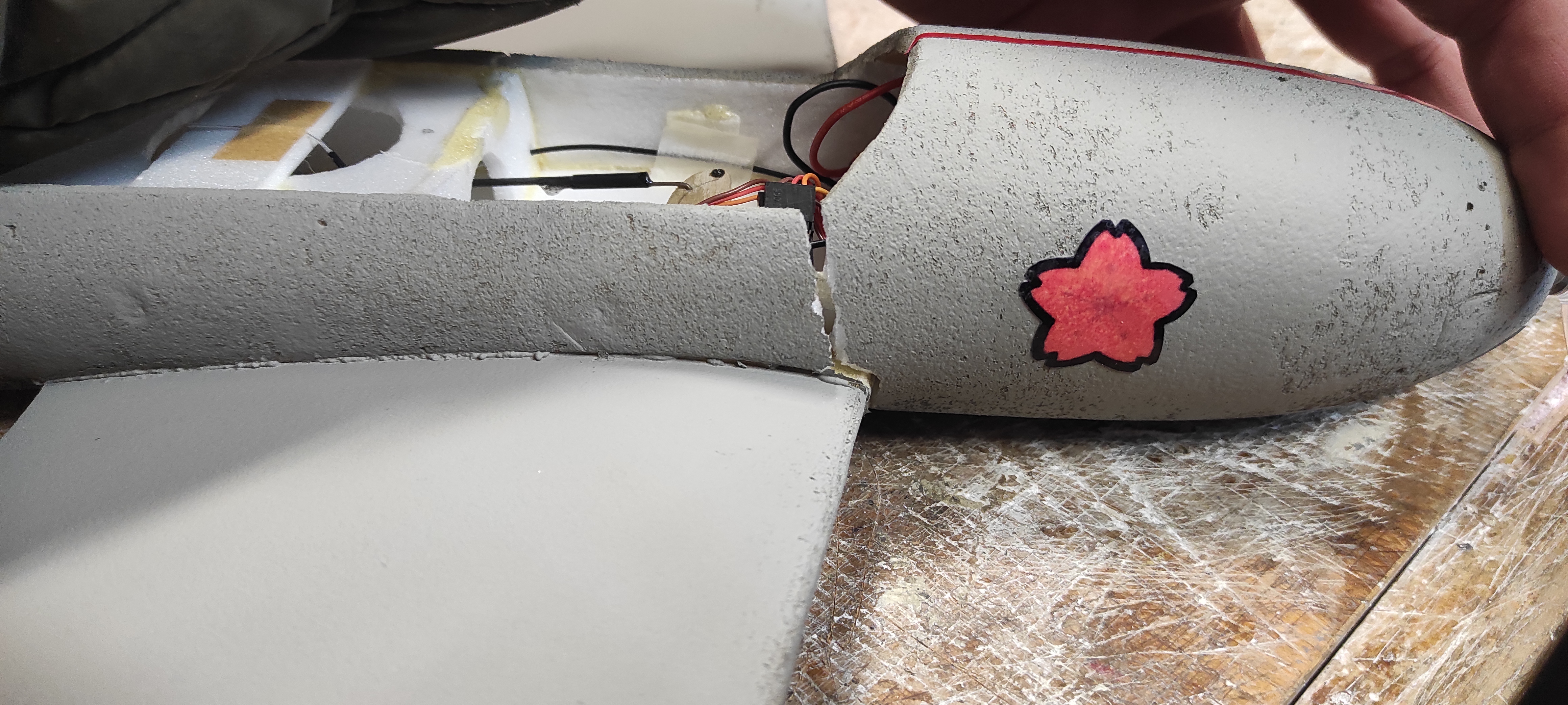 A takové jsou následky pondělní havárie při raketovém létání...hlavním důvodem byl přetížený trup v přední části, kde bylo umístěné zaváží pro kompenzaci hmotnosti raketového motoru, který je úplně vzadu. Přeci jen dohromady i s motorem dalších 30g navíc (letová hmotnost se zátěží cca 140g) a naráz pod blbým úhlem do země udělalo své.... A projevily se tím také slabiny trupu, kde byl nejvíce namáhaný. Naštěstí nic nechybí a jsou to jen čisté praskliny, které už se léčí