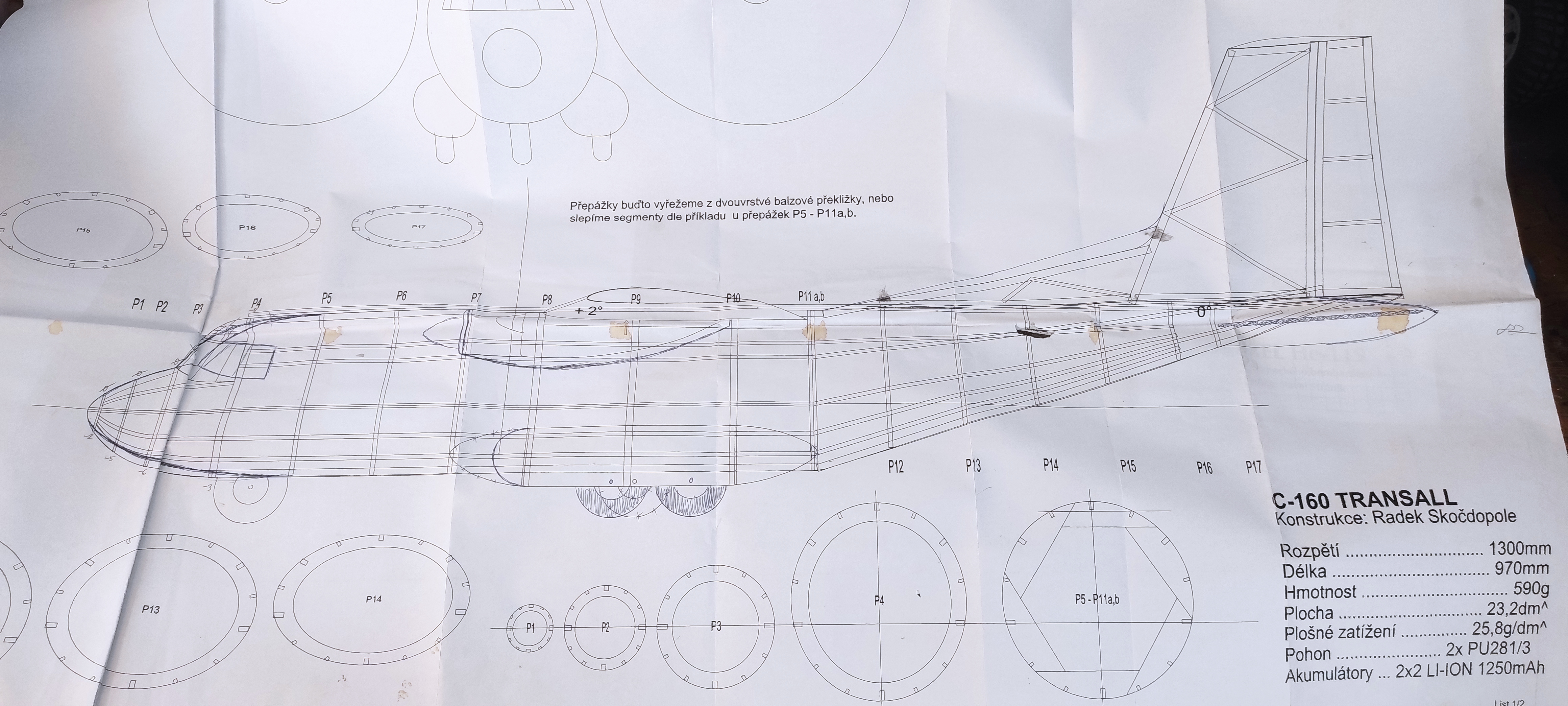 Dneska jsem náhodou potkal plánek podle kterého jsem stavěl plechového Transalla a při té příležitosti zrovna vyfotil tu část, kde mám propiskou dokreslené změny tvarů které mi neseděly se vzhledem skutečného letadla a těch jsem se i držel a podle nich letadlo postavil. Bylo značně zjednodušené, tak jsem si s tím dal práci a postavil podle mých úprav