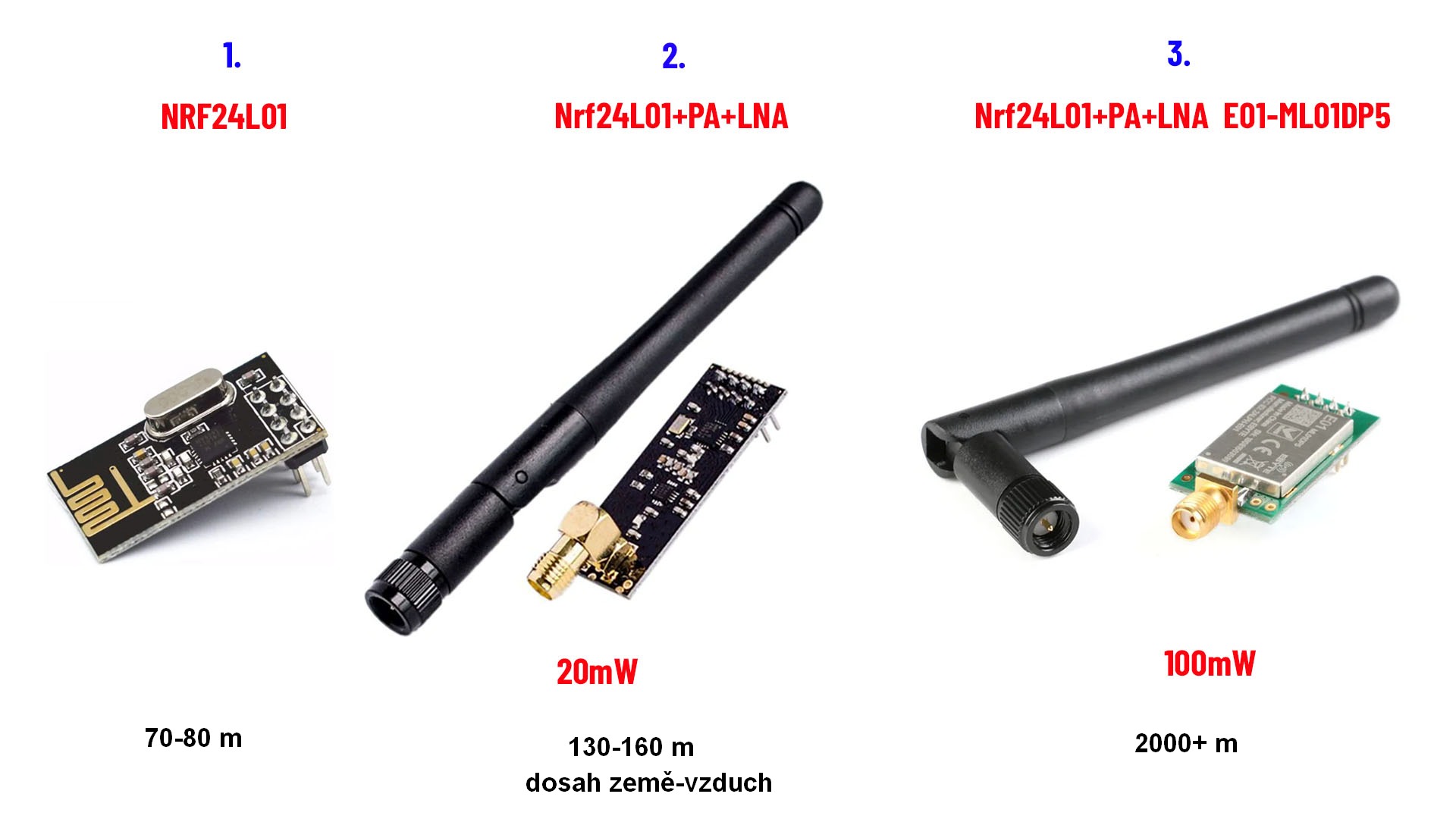 Zaujímavé jsou zkušenosti s dosahem vysílačů při osazení různými vysokofrekvenčnímí moduly 24L01 viz. odkaz a obrázek.