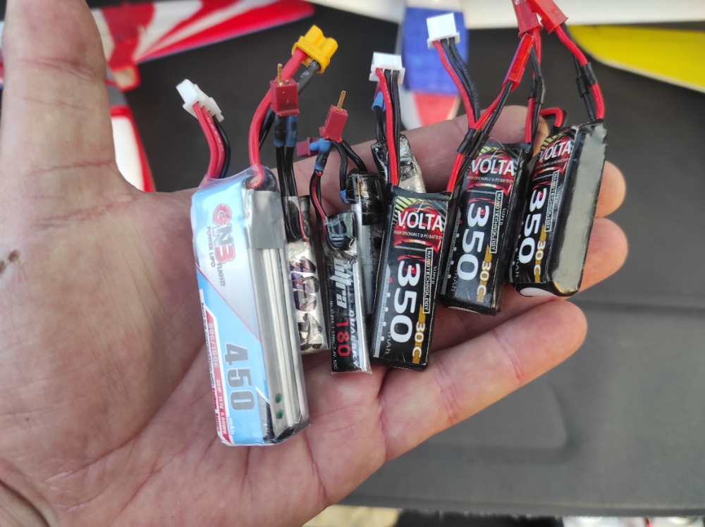 Samostatná kapitola jsou pohonné baterie, na fotce jich je celkem 8 kusů! 1-články, 2-články a jeden 3-článek. S Ventolinou jsem nakonec nelétal, začlo foukat, ale i tak mě to dalo na půl hoďky (i a výměnami baterek) takže za mě velká spokojenost a kdybych létal i s Ventolinou, za hodinu to vše nezvládnu vylétat