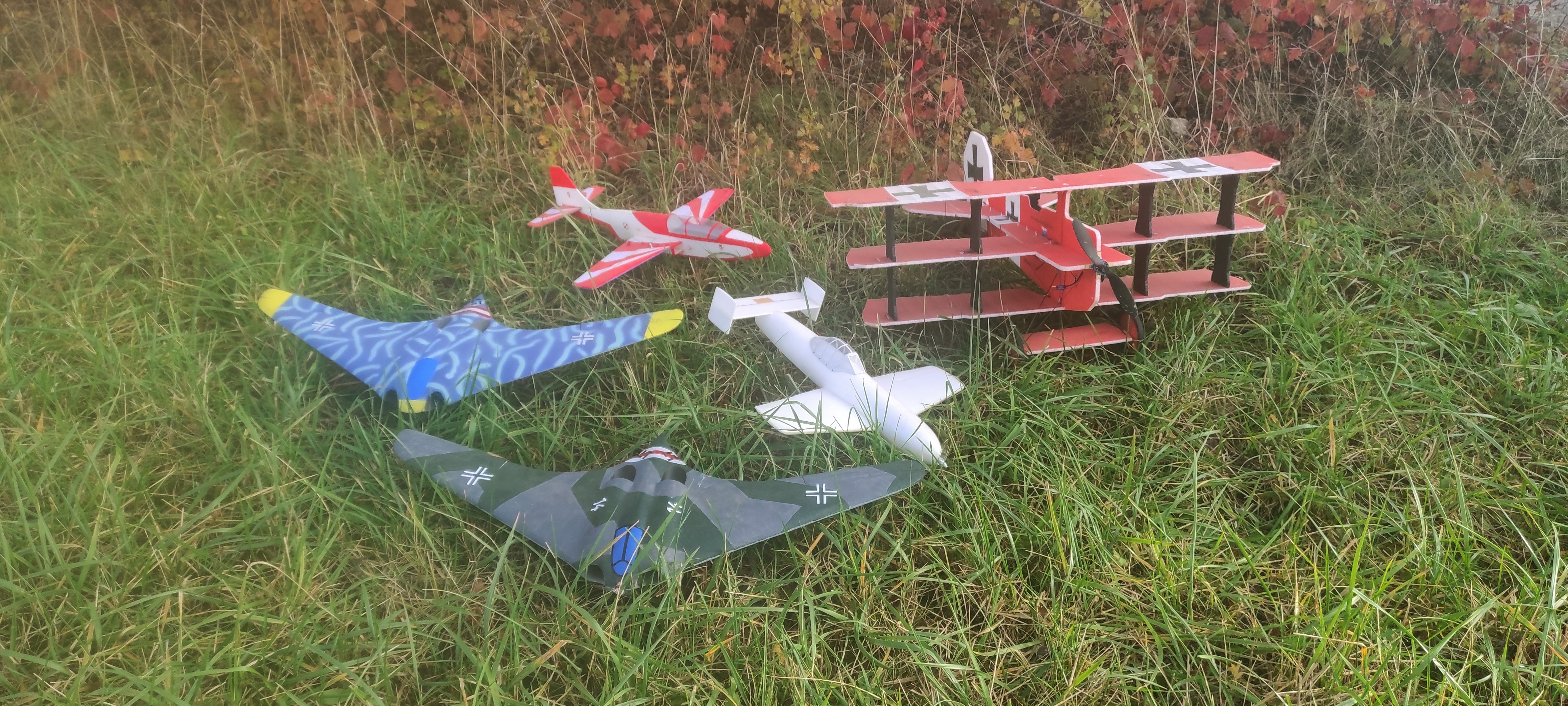 Blohm-Voss BV-208 -když tento model nechci při startu střílet gunolanem, je problém ho hodit, ale nakonec se na 3. pokus povedlo a užívali jsme si za letu jeho netradiční siluety i příjemných letových vlastností, kdy si toho nechá líbit opravdu hodně i na nízké rychlosti, prostě samokřídlo.. Angry bird -opět nějaké drobné úpravy pro vylepšení letových vlastností, skoro taková pologenerálka, ale odvděčí se skvělým letem na extra nízké minimálce, prudkým stoupáním kdy sotva letí, ale stoupá a nejlepší je nastoupat do výšky, vypnout motor a pustit páčky a kochat se, jak pomalu příkře klesá a měkce se posadí do vysoké trávy