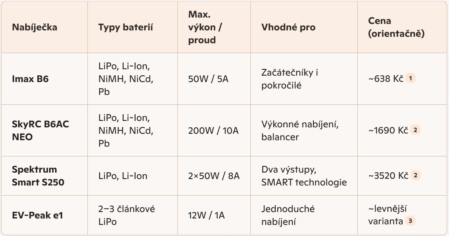 Typ baterie: LiPo vyžadují balancer, NiMH jsou jednodušší.