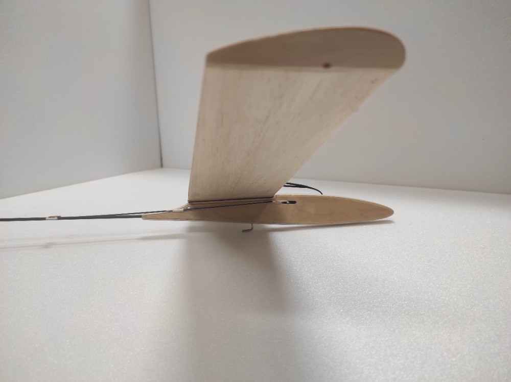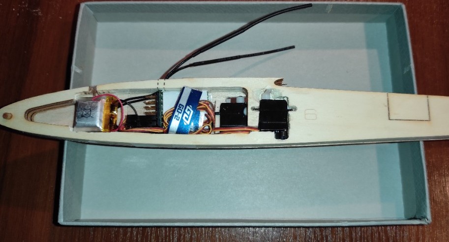 Rozpětí a délka je 600mm, hmotnost máme 70 gramů, ovládané S, V, serva nějaká 2-gramová, očesaný přijímač Hitec Minima (kvůli velikosti a hmotnosti) a napájí to 1S 100mAh