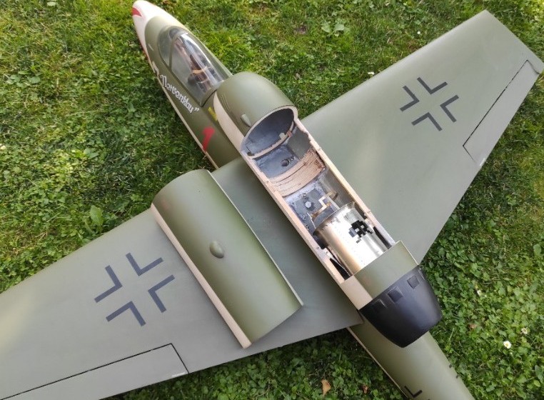 ale není osazený, je bez motoru, jen se servy.... Dá se s tím létat kdekoliv na modelářském letišti kde jsou trochu podmínky pro start a přistání, hlavně posečeno, ten můj se startuje gumolanem... Poslední myšlenka byla ho jen vyvlekat za motorovou vlečnou a zkusit jak to létá bez motoru, však za války se taky kdejaké éro nejdřív vlekalo bez motoru a zkoušelo se jak létá, než dodaly motory.... A je na turbínu, ono tenkrát na turbínu byl
